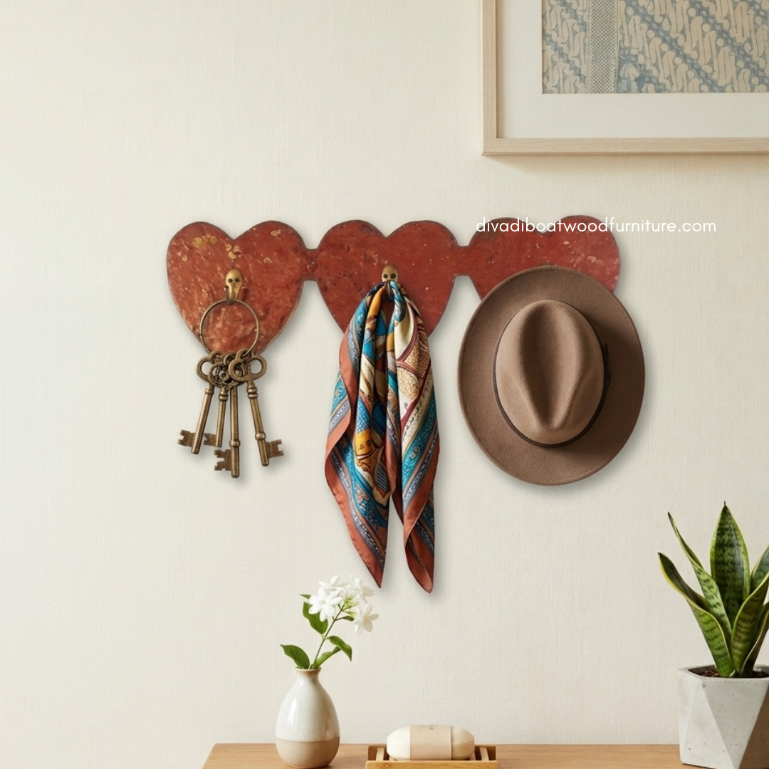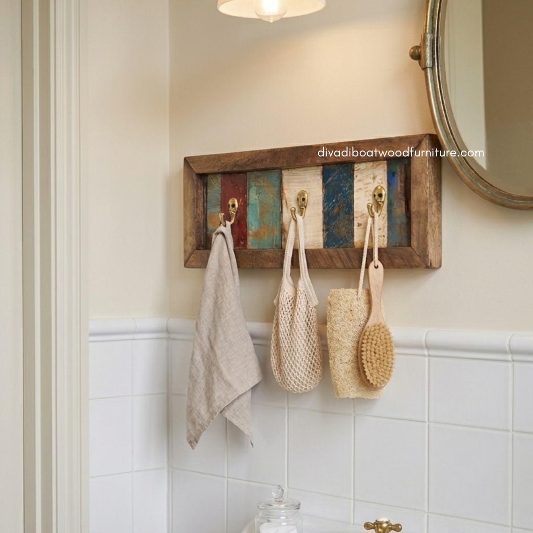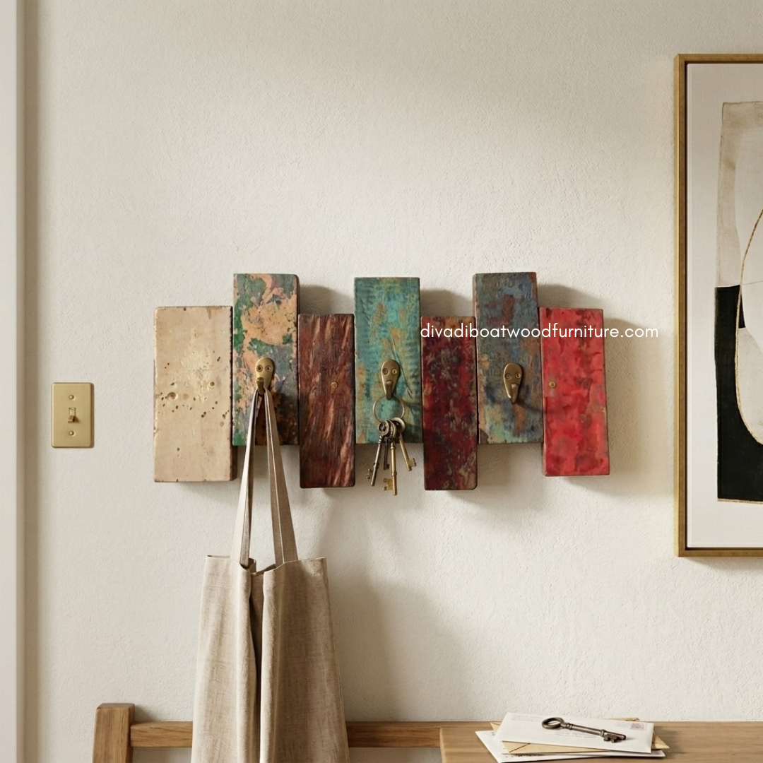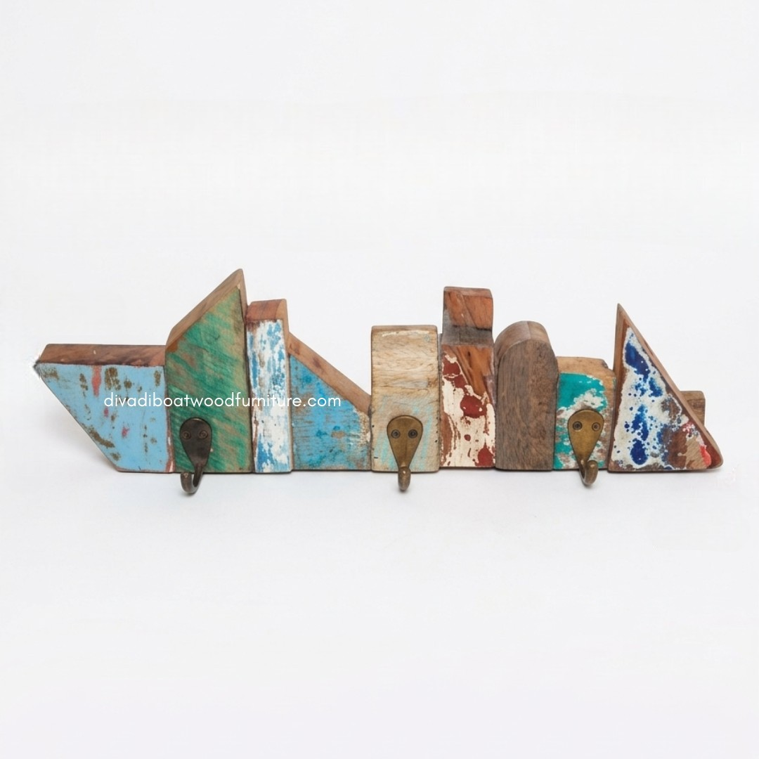 Hanging Coat is crafted from reclaimed boat wood once used by Indonesian fishermen, giving each piece a unique character and rustic charm. Designed with functionality in mind, it features a sturdy backplate that allows for secure and easy wall mounting. The strong hooks provide reliable support for coats, bags, hats, and other essentials, making it perfect for entryways, bedrooms, or hallway use.